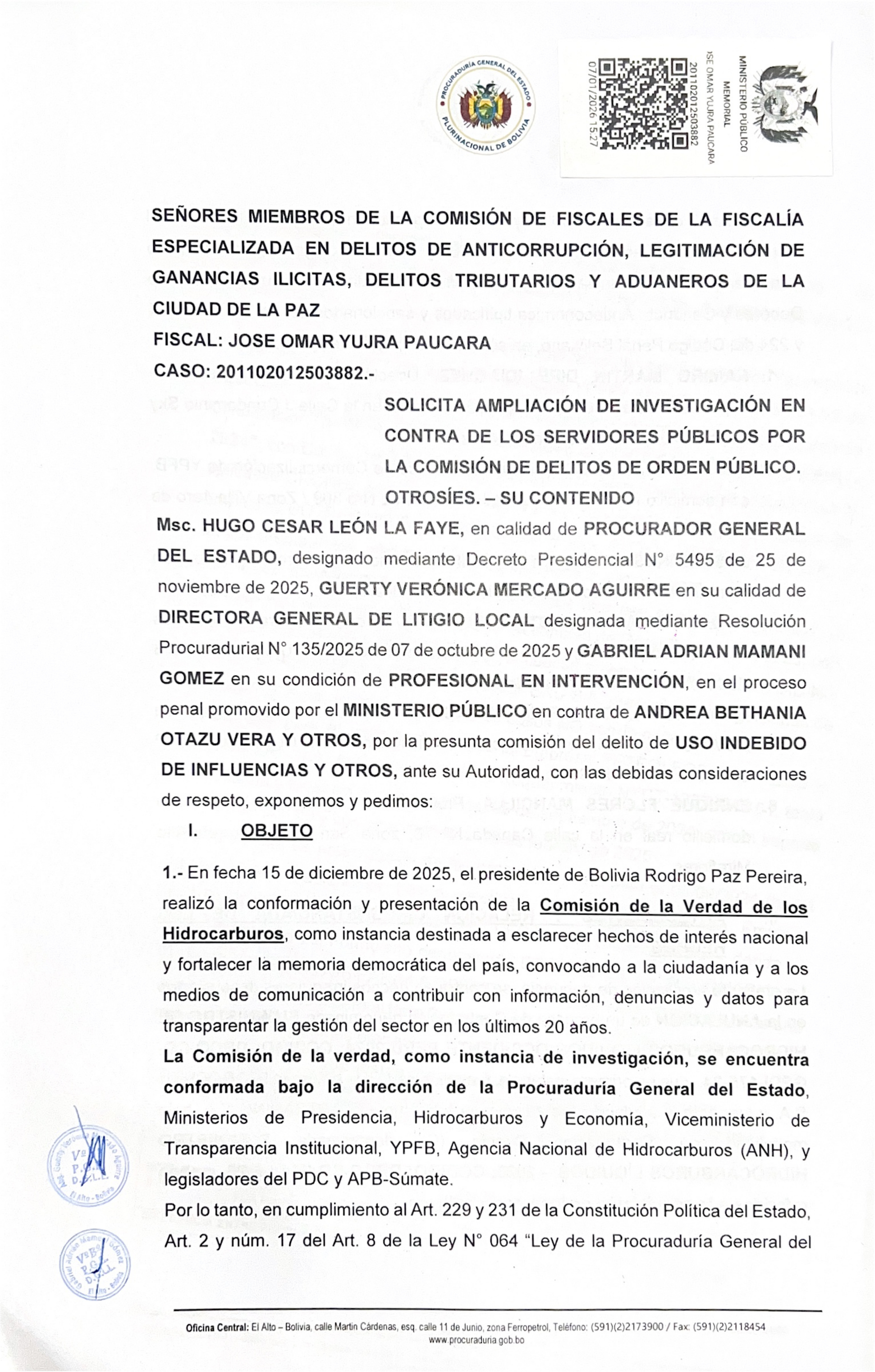 PGE - Prensa, La Paz, 07 de enero de 2026.- En el marco de las investigaciones llevadas adelante por la Comisión de la Verdad de Hidrocarburos sobre el caso Botrading I, el Procurador General del Estado, Hugo León La Faye, informó que se solicitó a la Fiscalía de La Paz la ampliación de investigación por la comisión de los delitos de incumplimiento de deberes y conducta antieconómica contra varios servidores públicos.